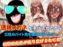 10円セール 【10円セール】透視メガネで三玖のバイト先を覗いてみた 【正より性を】 10円セール中!透視メガネで三玖のバイト先を覗いてみたの配信状況を徹底調査!FANZAでの販売形式やサンプル視聴、レビュー評価もまとめています。今すぐチェック!【d_623669】 2025.09.27 10円セールアナルおっぱいフェラ中出し学園もの専売巨乳成人向け正より性を潮吹き男性向け脚裸エプロン騎乗位